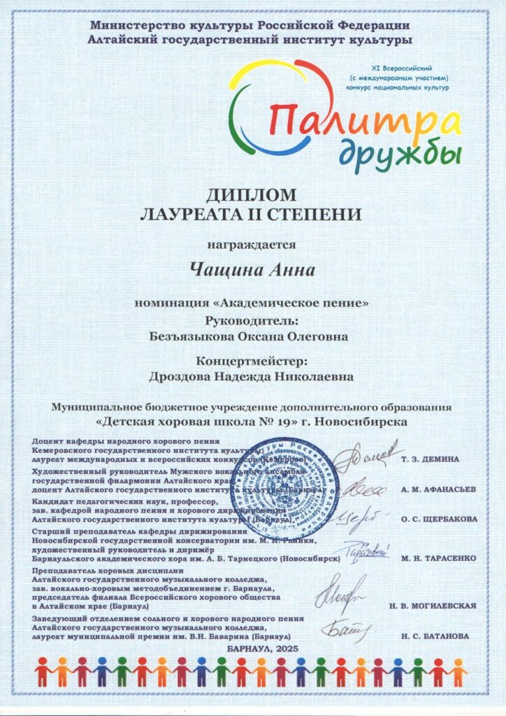 9 ноября обучающаяся 6 класса нашей школы Чащина Анна (преподаватель Безъязыкова О.О., концертмейстер Дроздова Н.Н.) приняла участие во Всероссийском конкурсе национальных культур «Палитра дружбы», который проходил в Концертном зале Алтайского государственного института культуры (г.Барнаул).