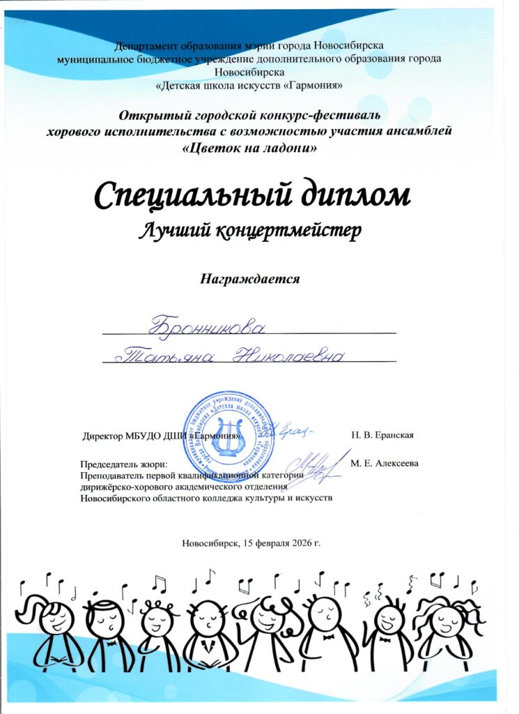 Руководитель – Коржова Татьяна Владимировна и концертмейстер Бронникова Татьяна Николаевна отмечены специальными дипломами.