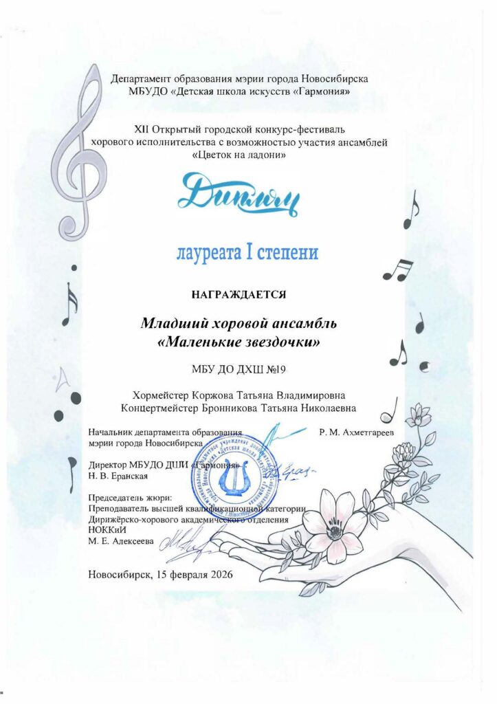 15 февраля в Детской школе искусств «Гармония» на площадке средней общеобразовательной школы № 109 проходил Открытый городской конкурс-фестиваль хорового исполнительства с возможностью участия ансамблей «Цветок на ладони». Наши детские коллективы на базе школы-интерната № 39 – младший хоровой ансамбль «Маленькие звёздочки» и старший хоровой ансамбль достойно выступили и с интересом послушали выступления других участников этого масштабного мероприятия. Младший хоровой ансамбль удостоен диплома лауреата I степени, старший хоровой ансамбль – лауреат II степени.