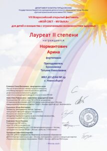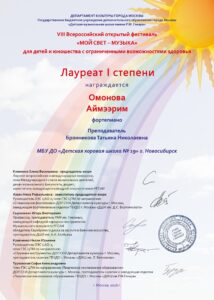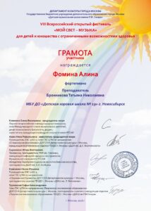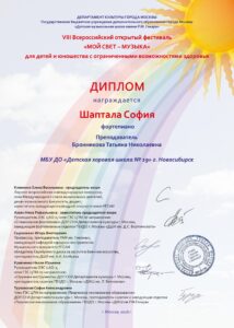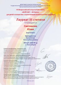 С 9 по 21 февраля 2026 года в детской музыкальной школе им. Р.М.Глиэра г. Москвы прошёл VIII Всероссийский открытый фестиваль «Мой свет – музыка» для детей и молодежи с ограниченными возможностями здоровья. Миссия этого фестиваля — развитие, поддержка и продвижение инклюзивного (доступного для всех лиц с ограниченными возможностями здоровья) музыкального образования для молодых музыкантов. 9 февраля состоялось открытие и педагогическая конференция, на которой педагоги, в том числе и имеющие инвалидность по зрению, делились своим ценным педагогическим и жизненным опытом. С 10 по 14 февраля в ДМШ им. Р.М. Глиэра и на других площадках проходили очные и дистанционные прослушивания участников фестиваля, которыми стали и учащиеся нашей школы на базе школы-интерната № 39 (преподаватель фортепиано Бронникова Т. Н.) . Шаптала София, Фомина Алина и Омонова Аймээрим очень волновались, но собрались и выступили успешно. Девочки с интересом послушали других участников, которые играли на разных инструментах – скрипке, контрабасе, домре, гуслях, трубе, арфе и её разновидности кельтской арфе и других интересных инструментах. Шаптала София (1 класс) стала дипломантом фестиваля, Фомина Алина (2 класс) получила грамоту участника, а Омонова Аймээрим (3 класс) стала лауреатом 1 степени. Нормантович Арина стала лауреатом 2 степени, Светлакова Юля -лауреатом 3 степени и Никитин Илья — лауреатом 2 степени дистанционно.