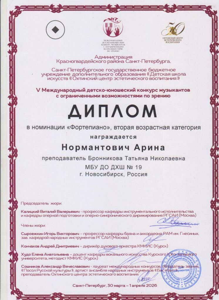 С 30 марта по 1 апреля 2026 года в Санкт-Петербурге, в Детской школе искусств «Охтинский центр эстетического воспитания», в течение трёх дней проходил V Международный детско-юношеский конкурс музыкантов с ограниченными возможностями по зрению. Мероприятие проведено при поддержке Администрации Красногвардейского района Санкт-Петербурга. Главная цель этого конкурса — предоставление равных возможностей молодым людям с нарушениями зрения для выявления одарённых детей, информирование общества об их творческих потребностях и гармоничном развитии.